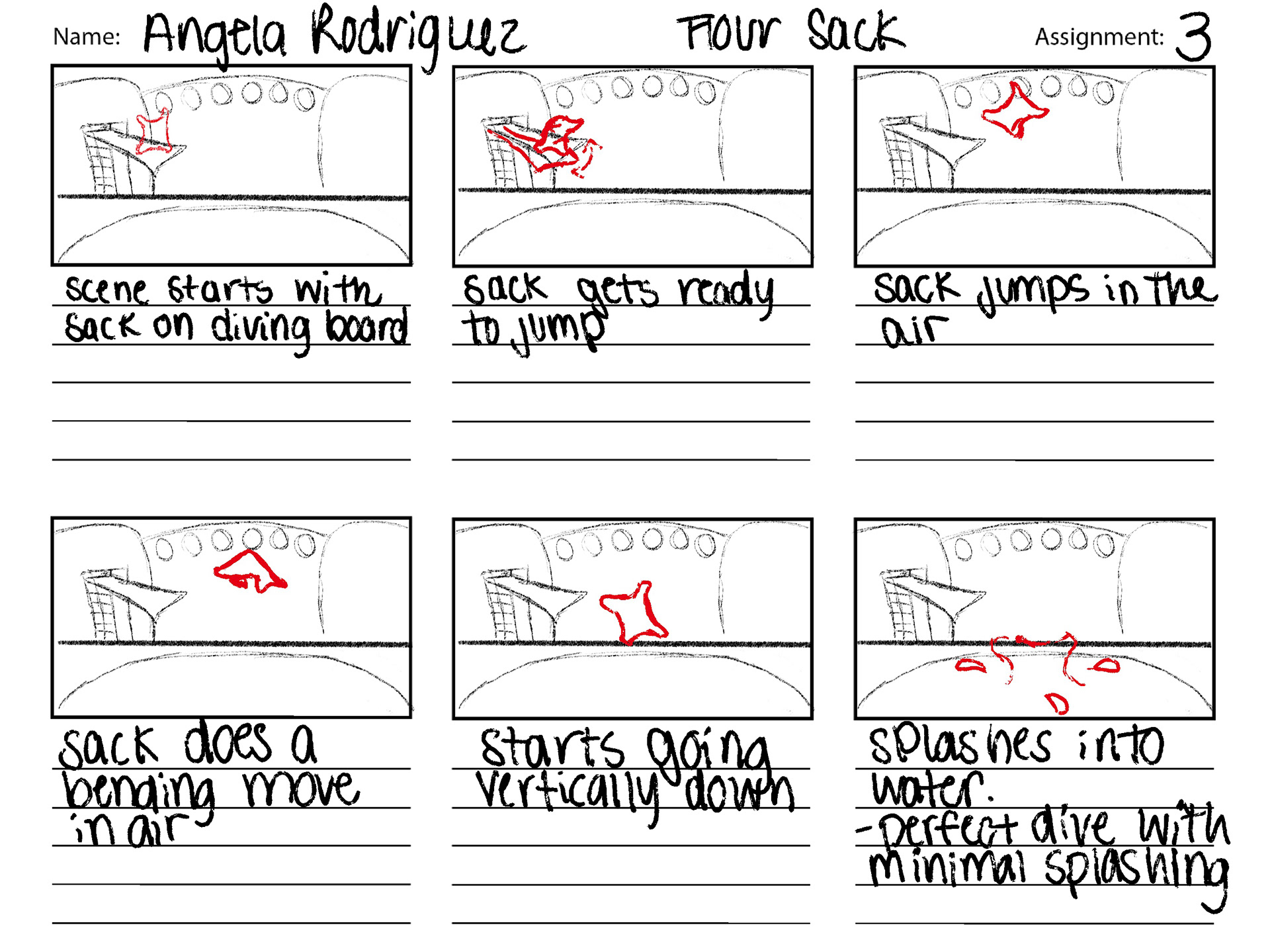 Flour sack assignment demonstrating the principles of arcs, path of action, and stretch/squash.