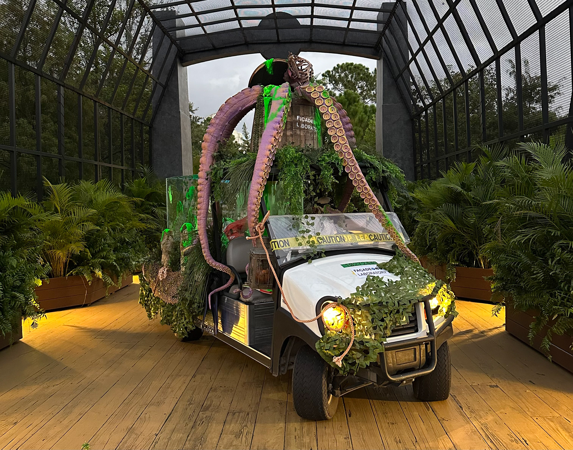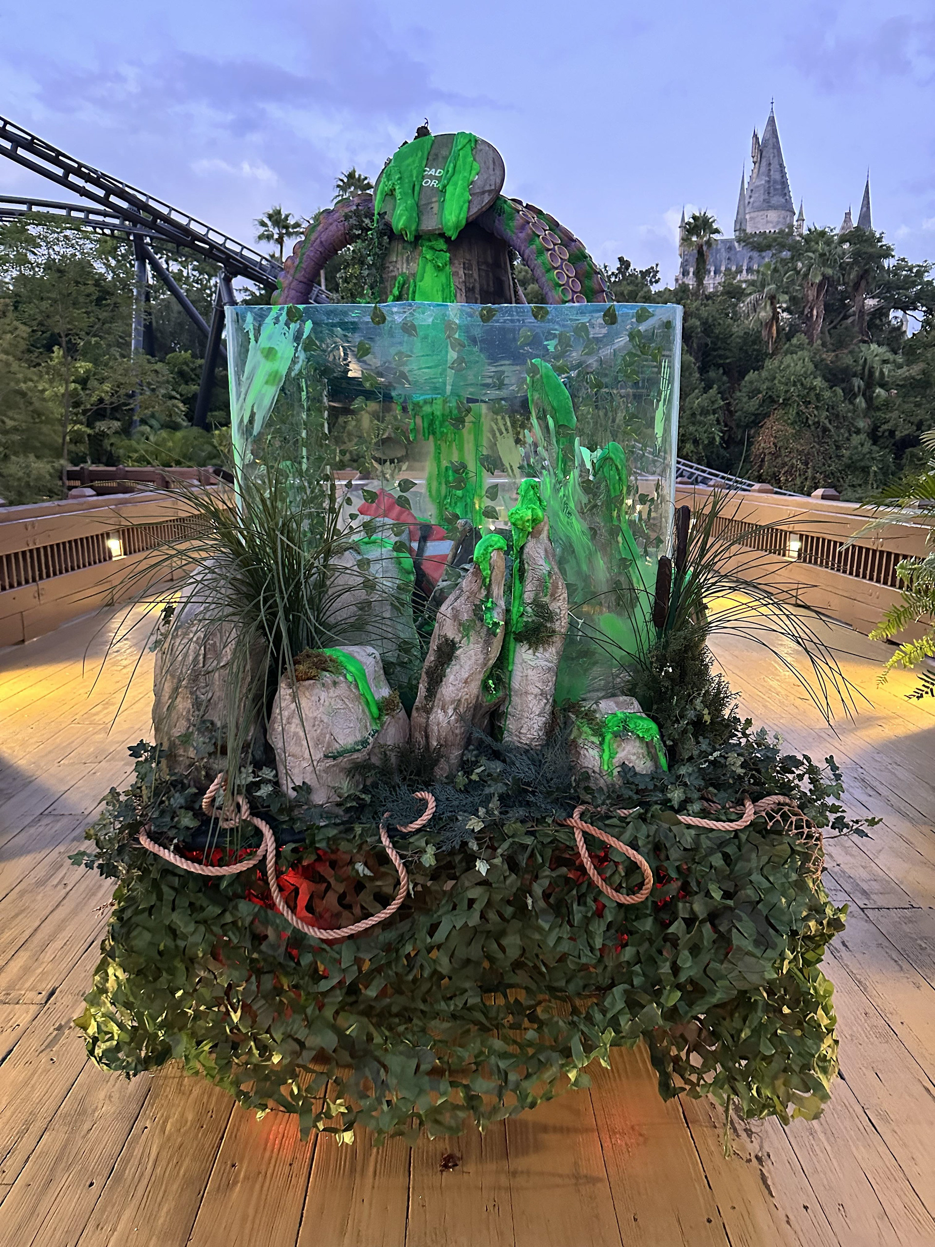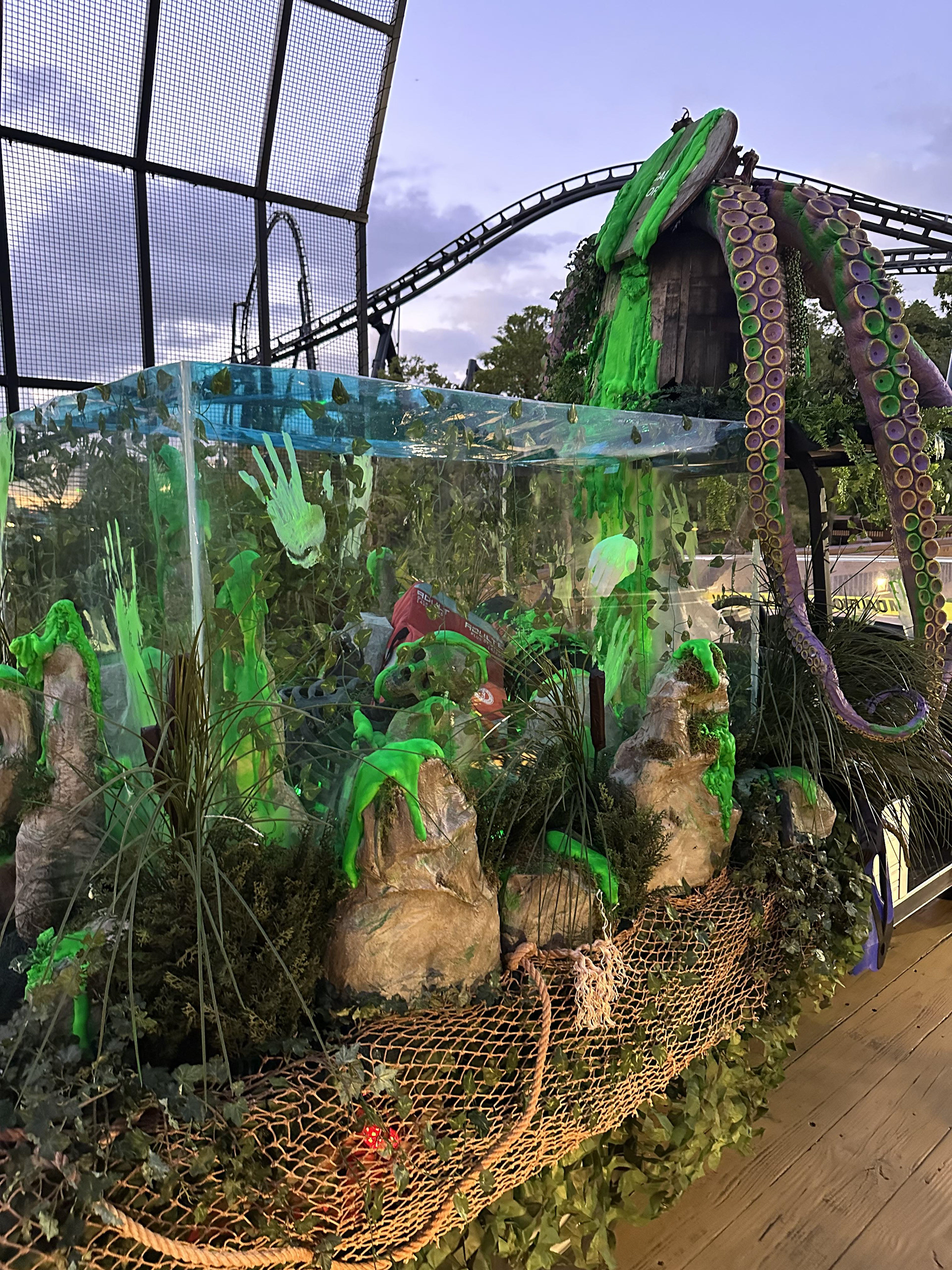 Created concept for golf cart design. Fabricated rocks out of paper pots and applied scenic treatment. Utilized neon paint for foam slime effect. Coordinated with maintenance team to create base for barrel and tank. Decided on final prop placement to meet aesthetic and storyline.